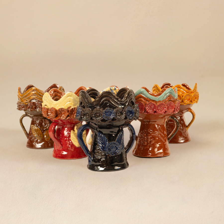 This Medium Copalera or Sahumerio Cup is 4.5" Wide x 5.5" Tall . This piece is inspired and beautifully painted with flowers, spirals, hearts and wings , all natural shapes that resembles the flow of energy and life. The piece is rustic and has imperfections, it may have chips, crazing and paint details. This product contains a hand-made straw fan to help the charcoal burn.